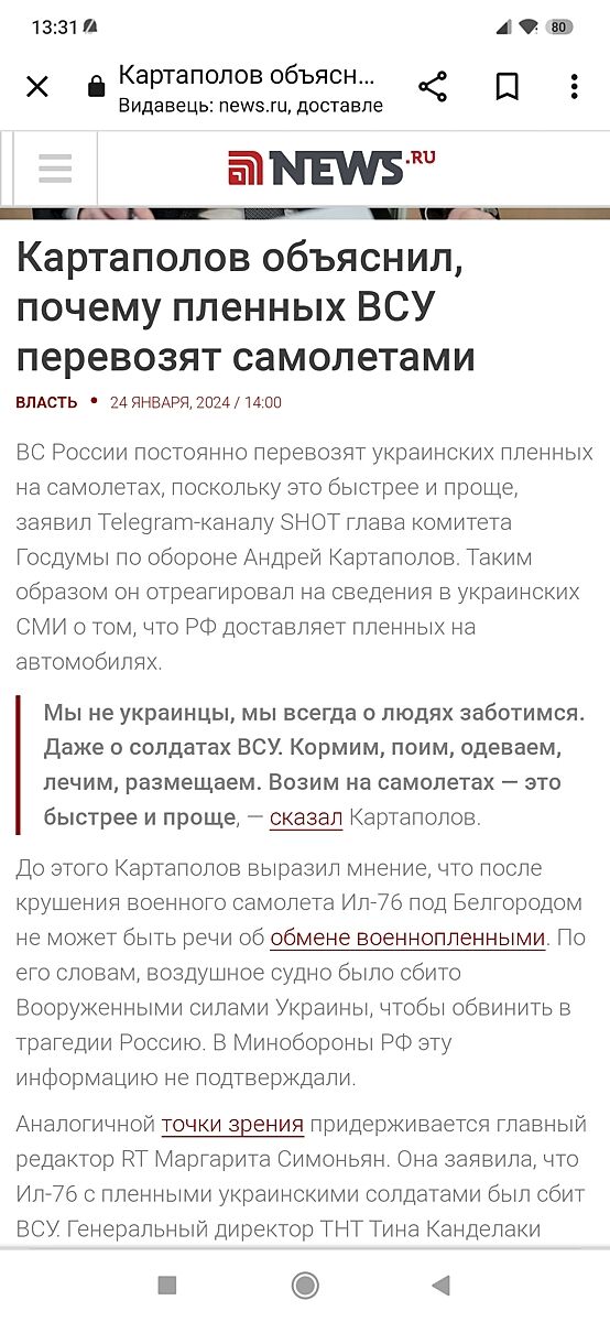 Почитайте интервью наших пленных. Их доставляли на таком же борту и 3 января 2024 г на обмен.
