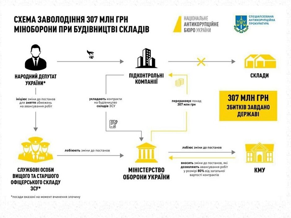 У чому була суть замовлення? 136 сховищ для боєприпасів у трьох військових частинах вирішили збудувати після низки пожеж на арсеналах. Будівництво усіх споруд мали здійснювати компанії із корпорації «Укрбуд». Один підряд на 1,95 млрд грн отримало ТОВ «БК «Укрбудмонтаж», ще два – на 2,3 млрд грн – ТОВ «Північно-український будівельний альянс». Перша компанія тоді була записана на дружину Максима Микитася, друга – на Андрія Якусевича. Обидві фірми входили до корпорації «Укрбуд».
