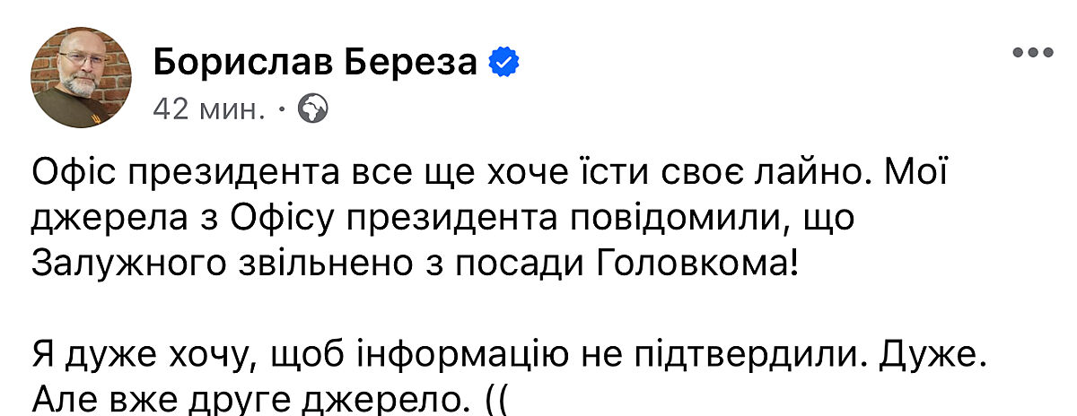 ⚡️Головнокомандувача ЗСУ Валерія Залужного зняли з посади, — екснардеп Борислав Береза, посилаючись на власні джерела.