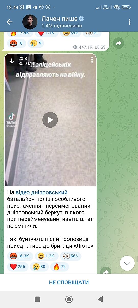 На видео - Днепровский батальон полиции спец назначения, переименованный днепровский беркут, у которого при переименовании даже штат не изменили. Полицейские бунтуют после предложения присоединиться к бригаде «Лють». Они готовы воевать, но в своем подразделении.
