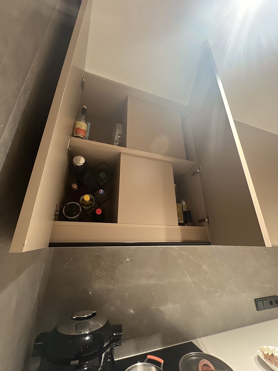 Ні, у мене не хрущ)) зліва є продовження і теж кутові шафи далі йдуть. Усі верхні шафки розпашні, тільки та, яка над витяжкою - на ліфтах відкривається угору. Єдиний мінус суттєвий для мене у такому плані - неможливо одночасно відкрити пмм та дверцята під мийкою.