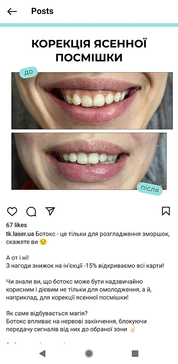Мені підрізали десну на верхніх зубах, щоб посмішка краще виглядала. Буквально по 1 мм, але вигляд став краще