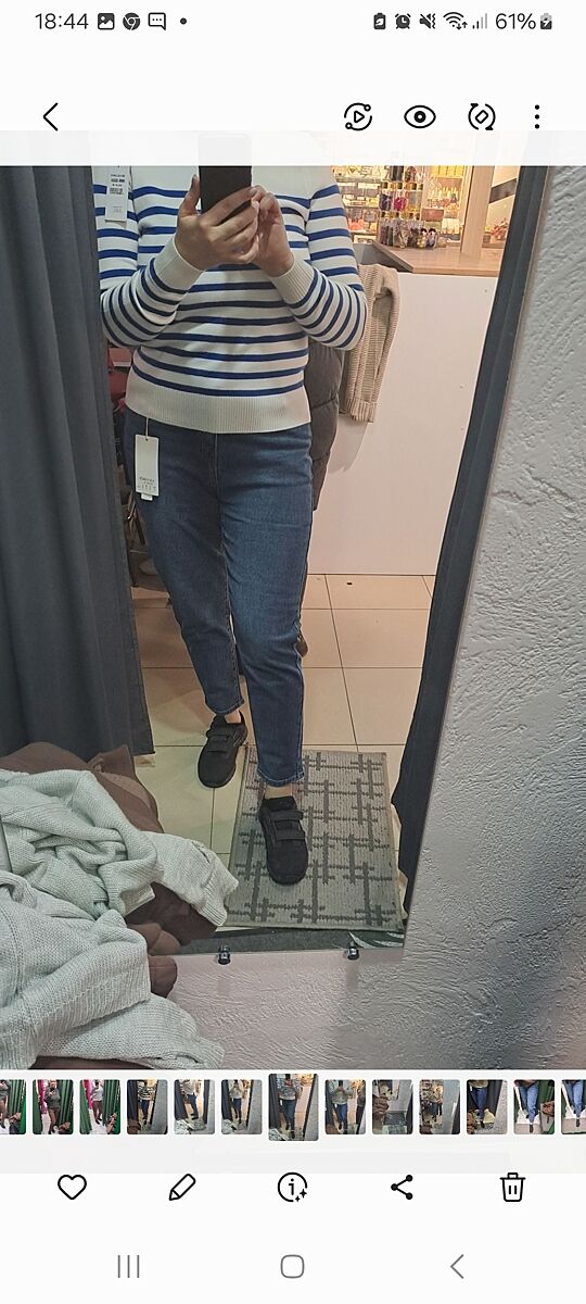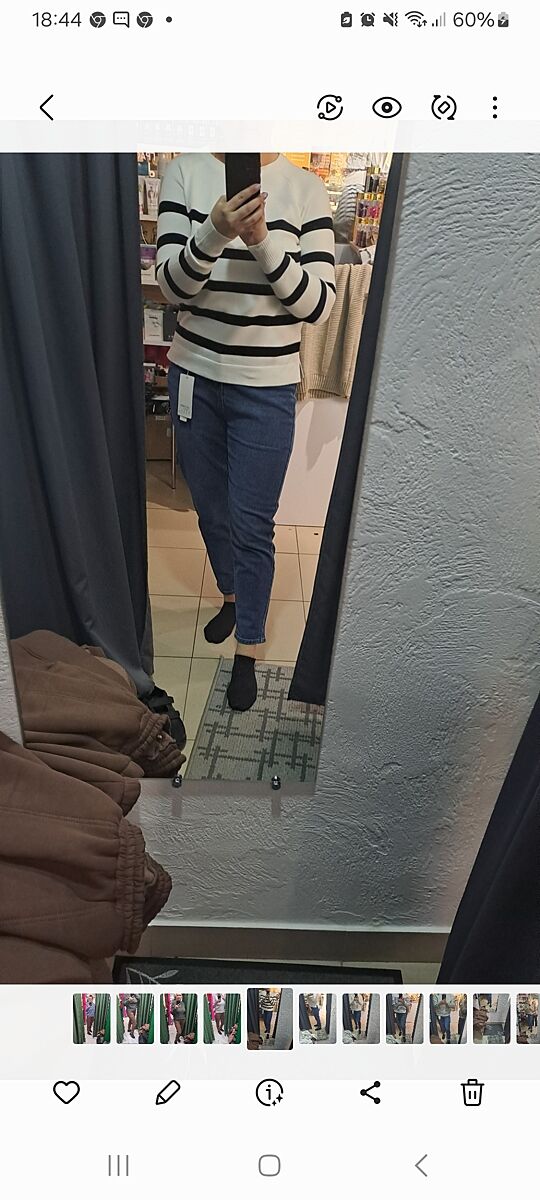 Кофта з ширшими смугами нічогенька. Джинси нє, а ото бежеве, що жіночка поправляє, треба спалити на вогні інквізиції) Неприємний колір. Хоча, може камера/екран так передає