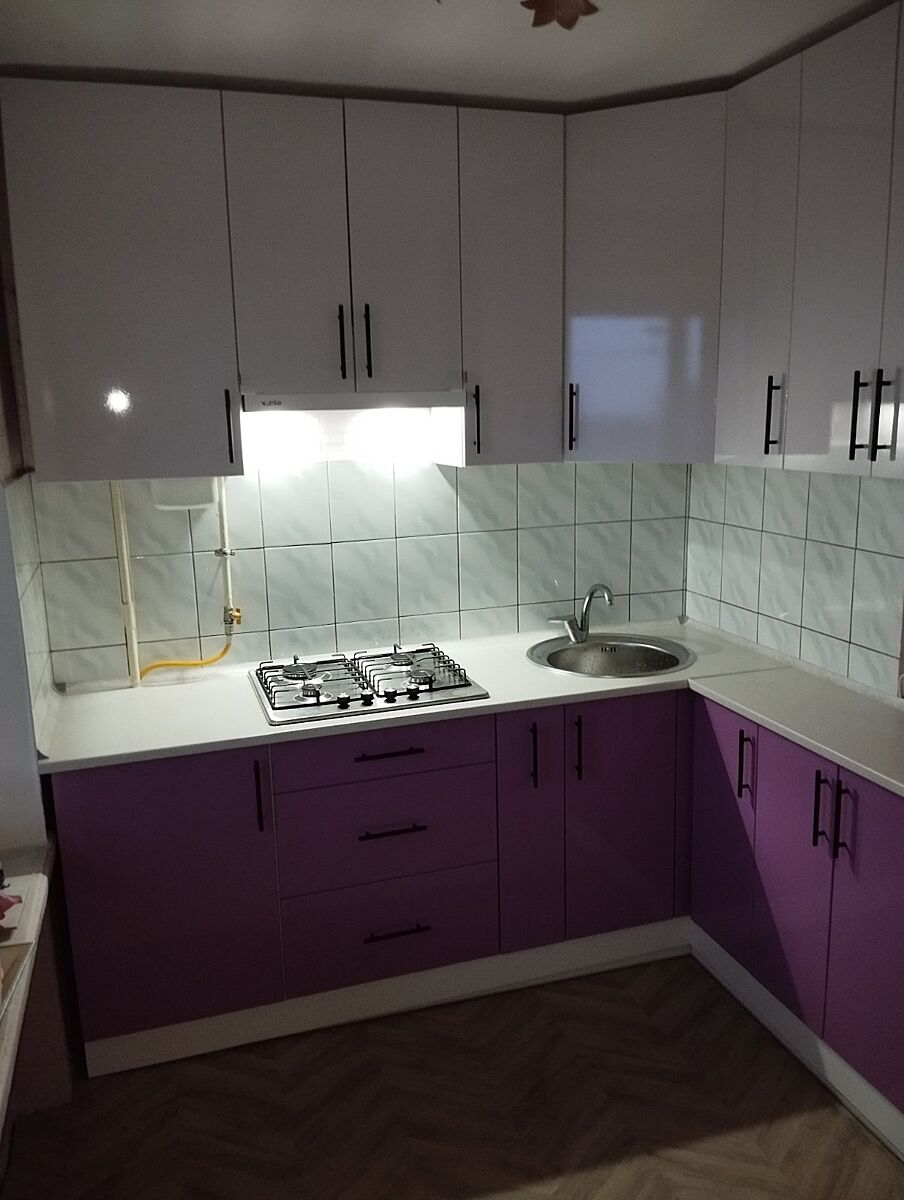 Кухня бузкового кольору, а плитка блідо зелена(((
