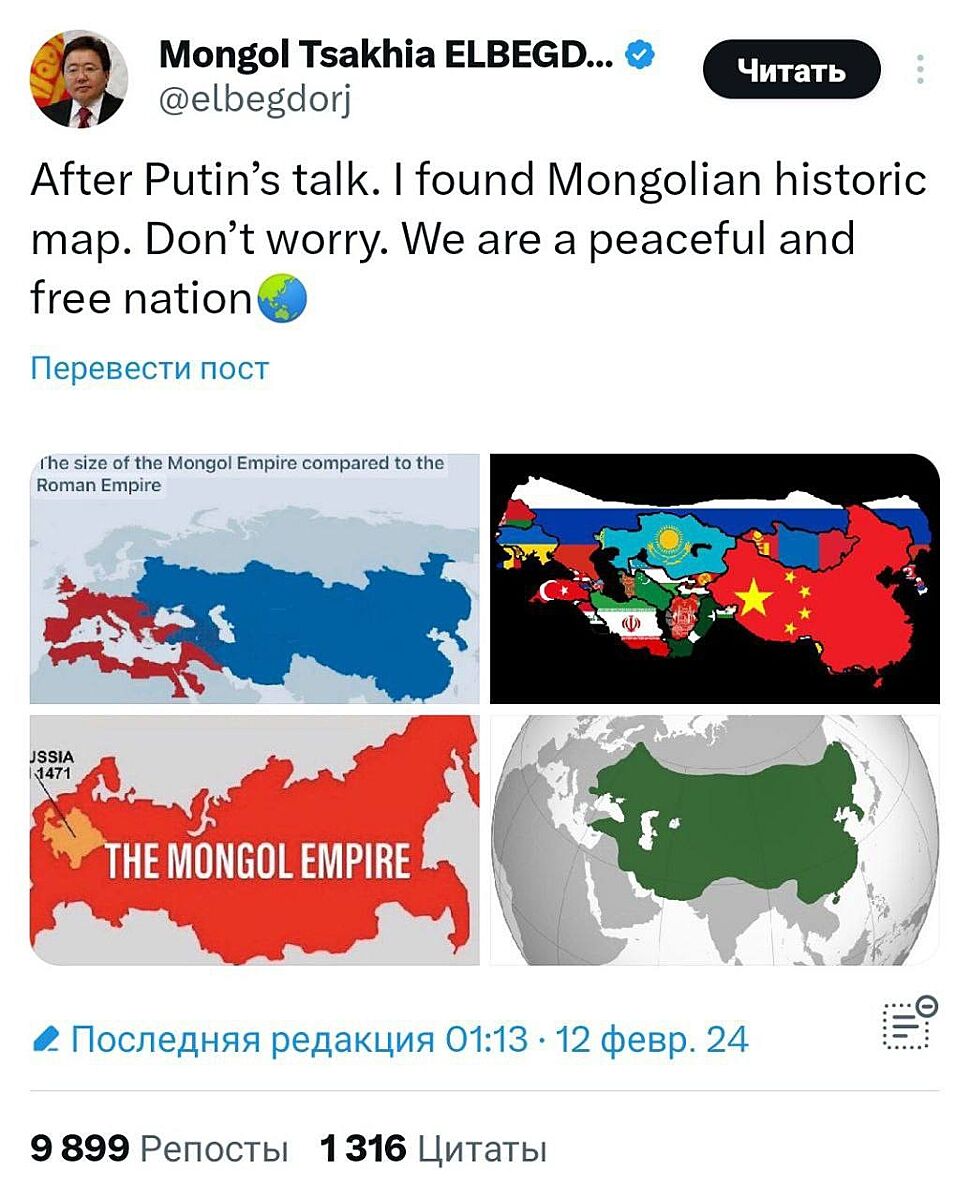 Карлсон сегодня рас№№делся какое шикарное пуйло и как оно хочет мира. Бывший очильник Монголии выложил карту, со стебом по поводу этого интервью.