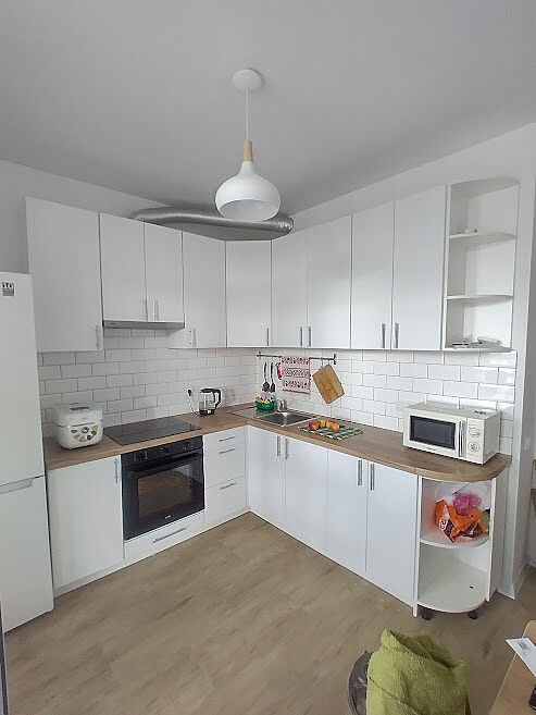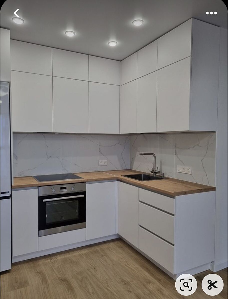 А, мийку не можно було зробити кутову? Так би, праворуч була б більша поверхня вільна ... Щодо ’фартука’, подобається скіналі, дуже зручно, швидко монтувати, під криви стіни , любий колір. Але, не люблю різнокольорові, бо на кухні і так багато ’декору’...