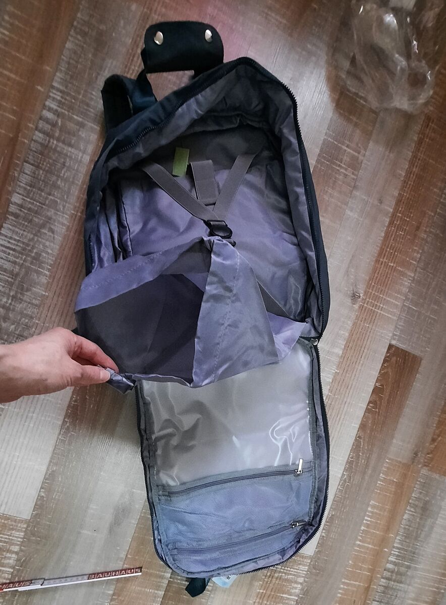 Там есть вывод для зарядки, отдел для мокрых вещей, его можно изменить в размерах, много отделений, есть штука ключи цеплять, чтобы не потерялись