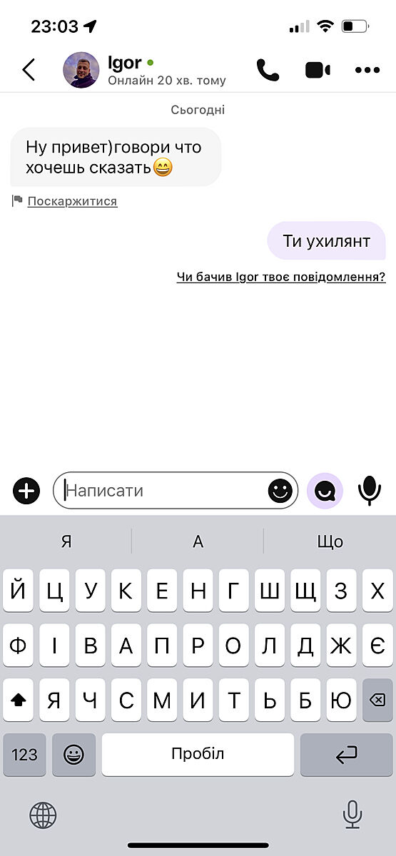 Ви знаєте і в мене зі своїм теж така була роз ова, я кажу не кажи мені, що ти боїшся, ухиляєшся, бійся мовчки, ну чоловік же має бути мужній в очах жінки.