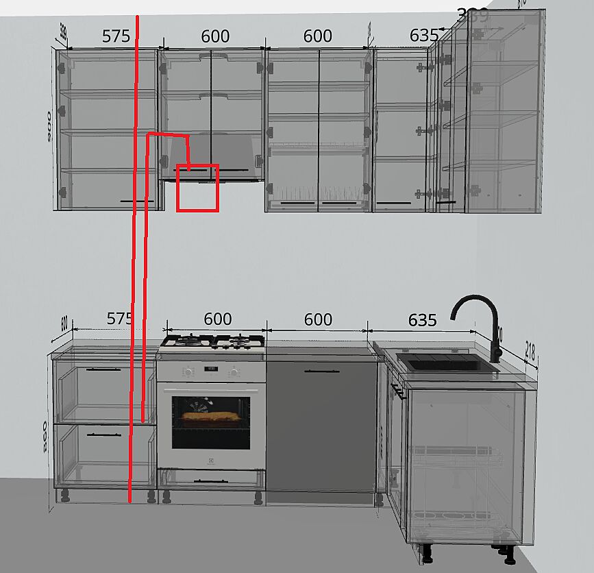 По документам посудомойке нужна глубина 55 см минимум на установку. Я планировала столешницу на 60 см. Снизу колено газовой трубы, оно 7 см от стены. По плану где посудомойка рядом с холодильником газовая труба прямо за посудомойкой, еще и счетчик. Сейчас срочно нужно решить вопрос с планировкой, потому что газовщики ждут ответа куда переносить счетчик.