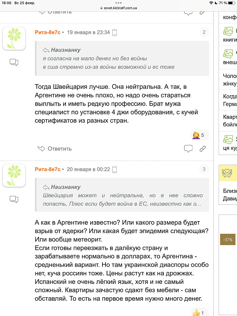 Я просто в шоке. Смотрела все, но ехать реально некуда. Денег не хватит. Германия - нет, там сейчас расселяют в спортзалы, мужу так нельзя, как и в коммуналку. Думала про Болгарию, но там много за рашу и русских полно. Пока склоняюсь к самому дешёвому городу в Румынии. Но там нет украинских школ, а дочь онлайн не тянет особо (она в младших классах). Я на работу выйти не могу, была травма позвоночника и физическая работа мне противопоказана.