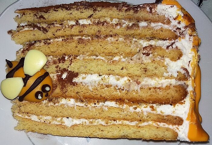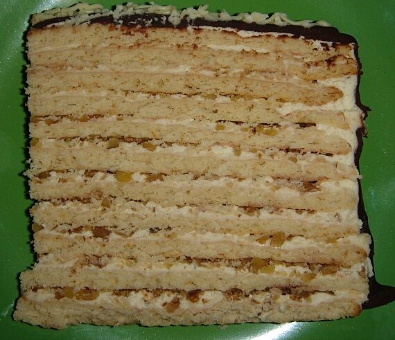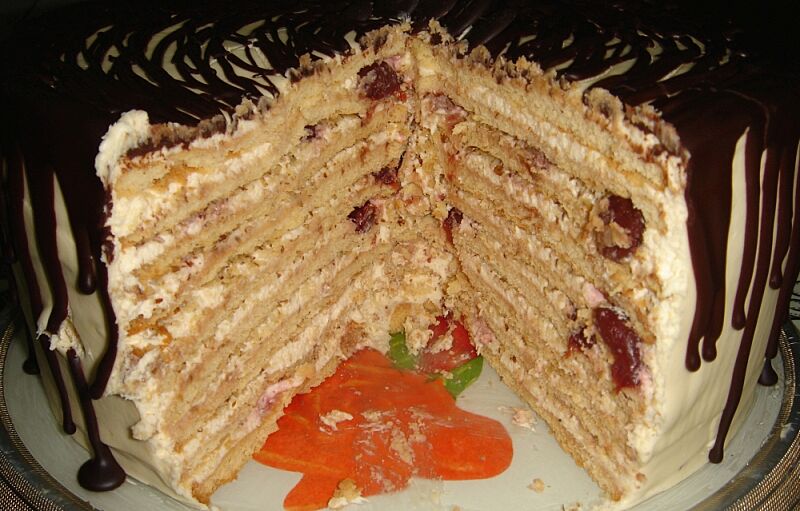 не люблю чернослив. вишню из варенья достаю . но у меня рецепт и в медовике толстые коржи (заливное тесто),а не тоненькие( тесто раскатывают) . поэтому всего 3 коржа и тостый слой крама сметана+сахар и загуститель сметаны.