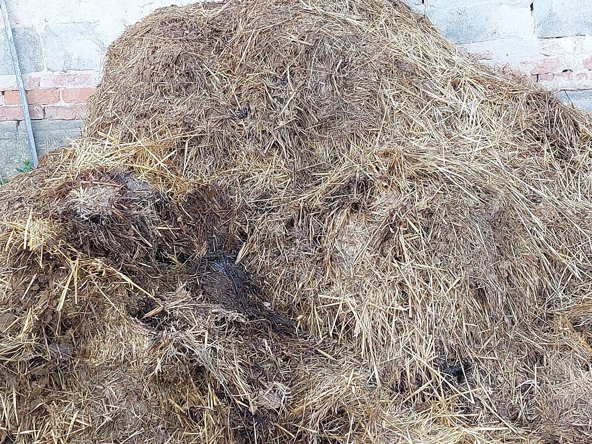 Это не старый. Старый мы брали, он как труха вообще. Просто загружаешь труху непонятную. А этот с соломой, значит не перепрел. Вы его сгрузите в яму толстым слоем, он начнет преть, погуглите видео на Ютубе, там реально пар идет, как от кипятка