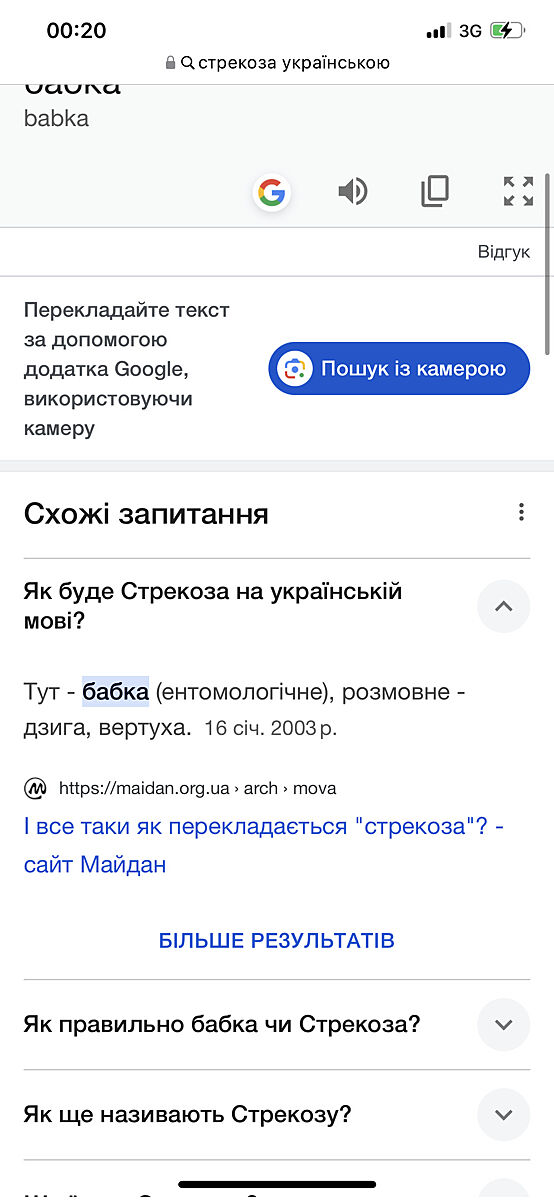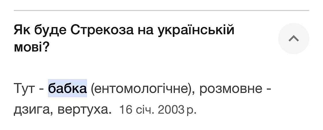 Якщо вам так цікаво ось повний скрін, в самому самому вверху запит «стрекоза українською». Обрізаний шматок до якого ви причепилися це Гугл пропонував подібні запитання. Ви задоволені ?🤣
