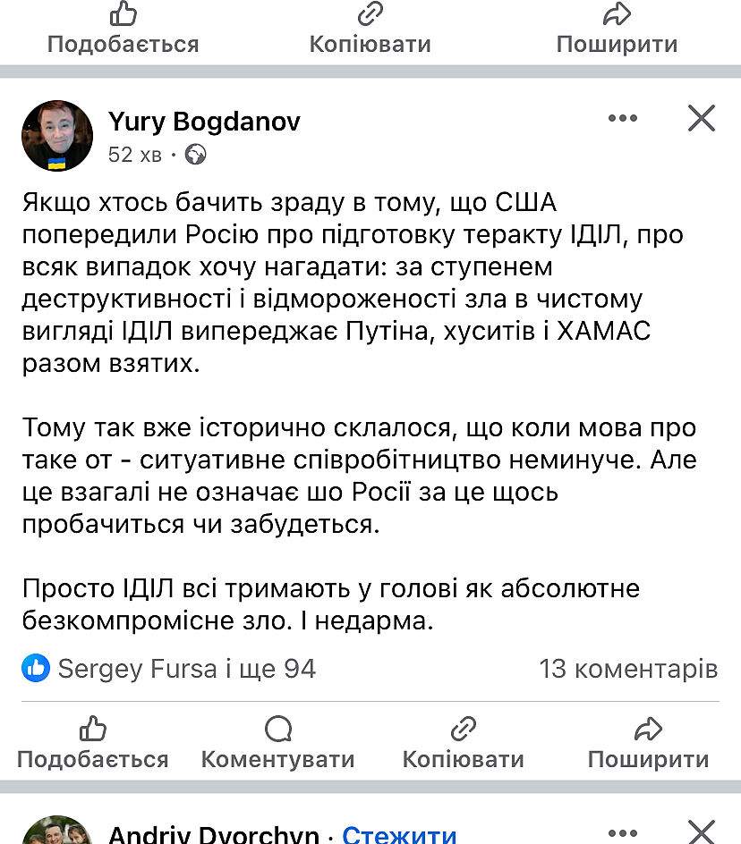 Иранский журналист Хасан Мафи: Кстати, Россия не заявляла, что теракт на московском концерте был осуществлен ИГИЛ. Но даже если это было ИГИЛ, мы все знаем, что те, кто создал, финансирует и вооружает ИГИЛ, – это те, кто поддерживает, финансирует и вооружает Украину.