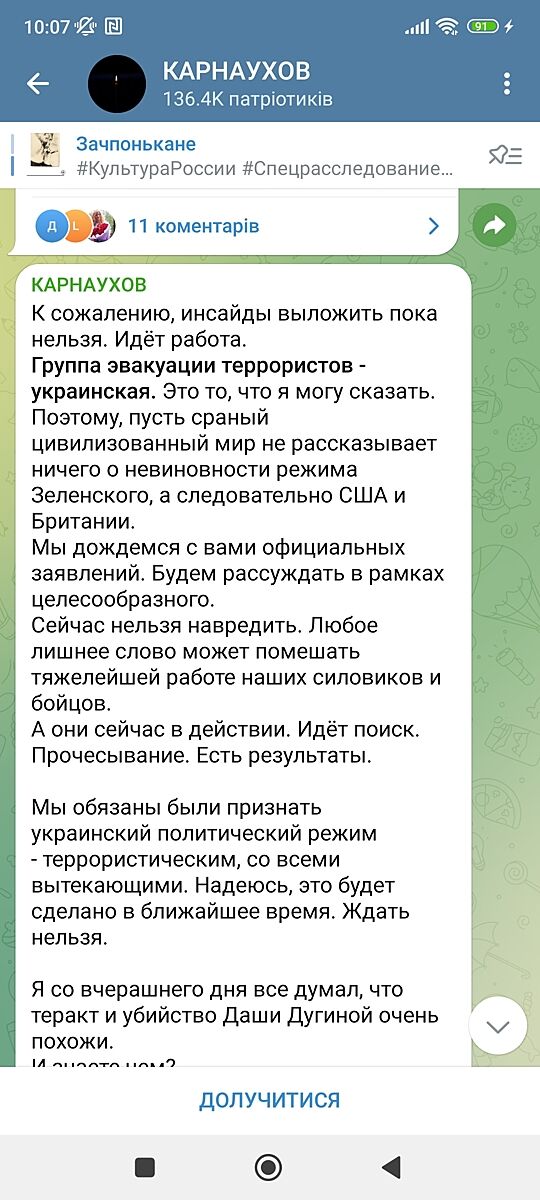 Даша была просто молодой девушкой, смерть которой не несла никакого политического и военного значения. Её просто убили. ГУР, увидев, что отца Даши нет в машине не смог отменить операцию, потому что не понимал, для чего нужен тот теракт, кроме демонстрации возможности проведения подобных акций.