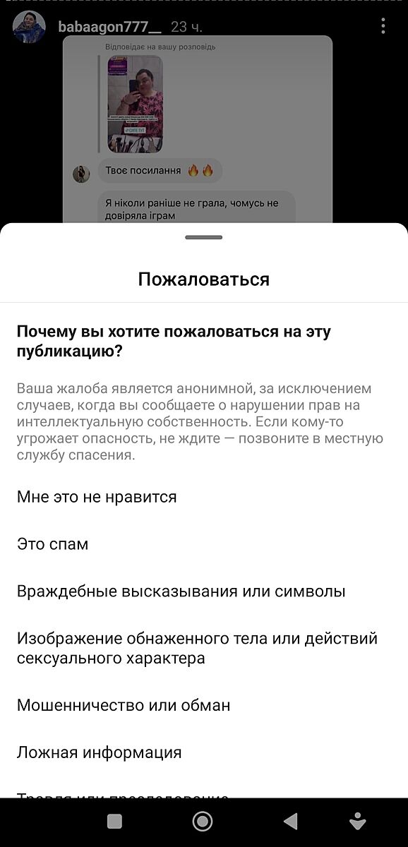 Я напишу свою інструкцію: спочатку в сторіс нажимаємо три крапки, потім поскаржитися, потім вибираємо , мошенничество или обман’ і відправити. Готово.