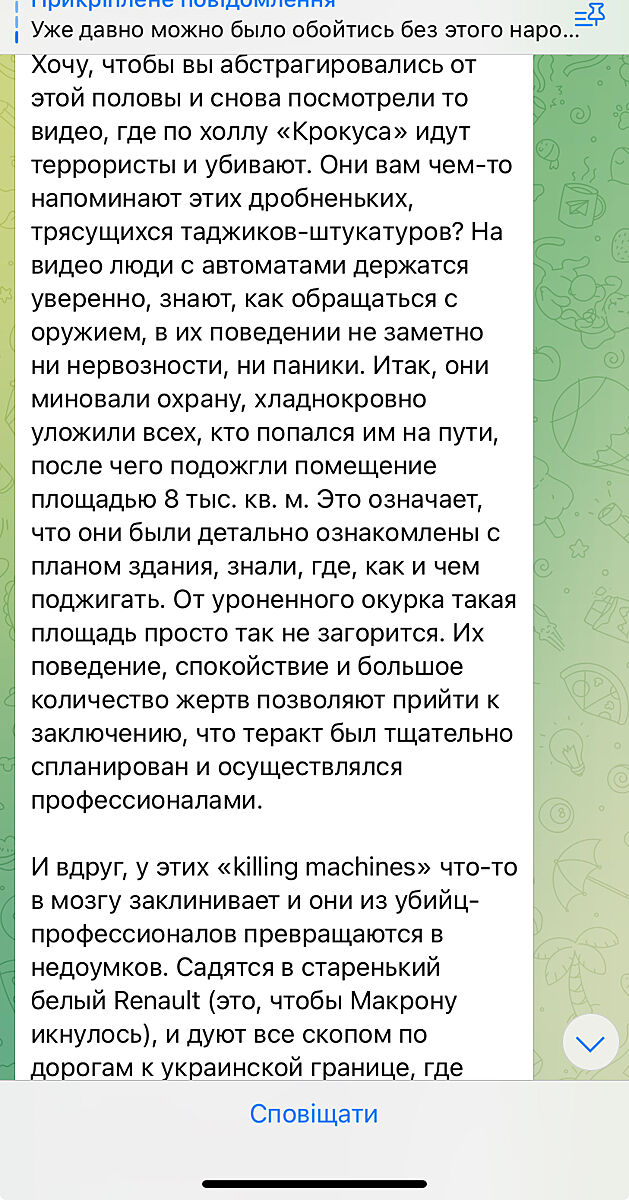 До речі, на відео з Крокусу вони не так, щоб організовано діють (і накачані там не всі, а серед затриманих не всі дрищі). Бігають взад-вперед кучкою. Їх можна було б однією чергою покласти, якби було кому. Розстрілюють для ’покрасовацца’, ті різання ножем чисто вихваляння.