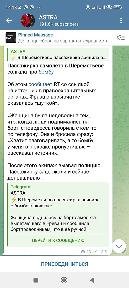 По данным Telegram-канала, женщина едва поднялась на борт самолета, вылетающего в Ереван, как тут же рассказала бортпроводникам, что в ее ручной клади бомба.