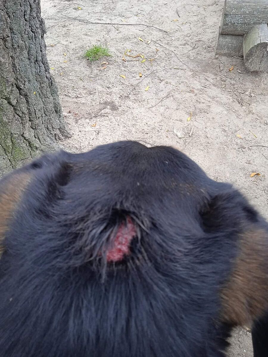 Можливо була драка, схоже на рвану рану, може зачипилась десь, думаю хоч якусь антисептичну мазь ( левомеколь чи щось інше ) прикласти звісно якщо вона дасться