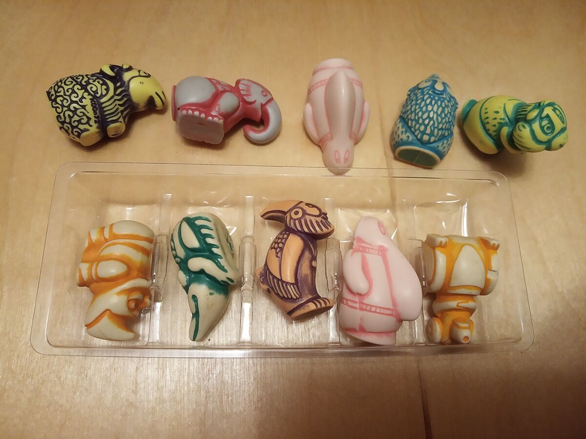 Интересная коллекция с бременскими музыкантами лет 5 назад была, и еще с принцессами дисней года 3 назад. Это уже с дочкой собирали. А в детстве была коллекция,бегимотиков. Особенно нравилась девушка-бегимотик, у нее шляпка снималась)