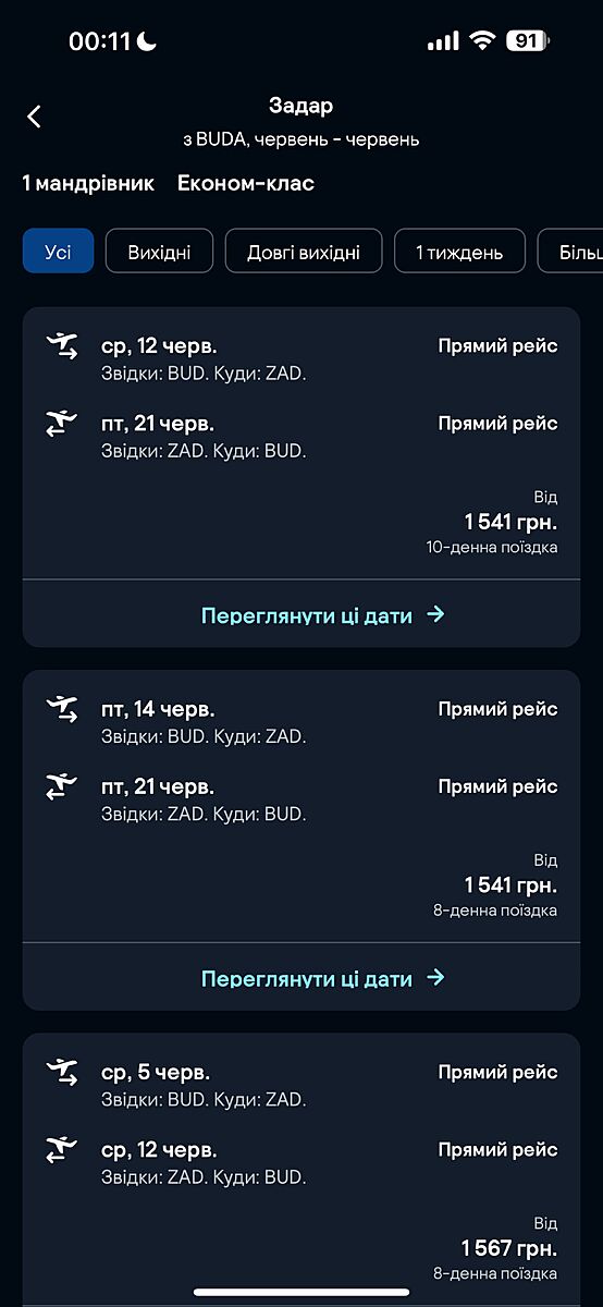 Літаком наприклад Будапешт-Задар туди-назад в черні від 1541грн