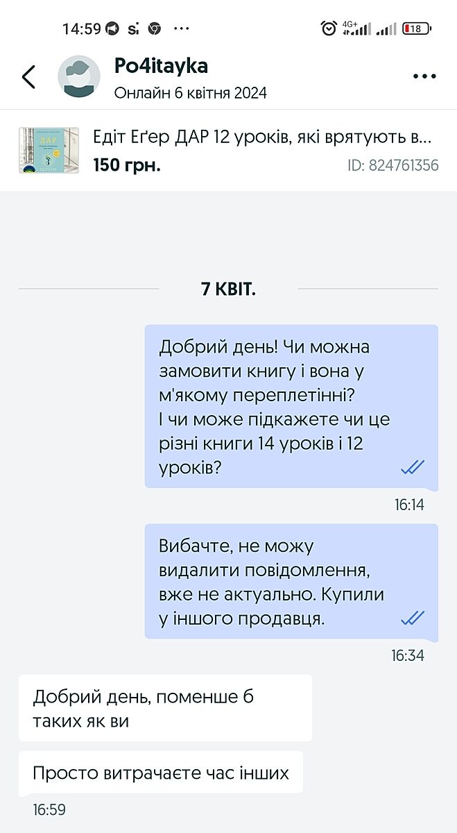 Обое рябое. Ну купили и купили у другого продавца. Зачем вы отчитываетесь. Ну и прод какой-то хам. Я лично тоже не понимаю, когда мне потом пишут ’нашла дешевле’. Я конечно не хамлю, просто пишу ок, либо вообще ничего не отвечаю