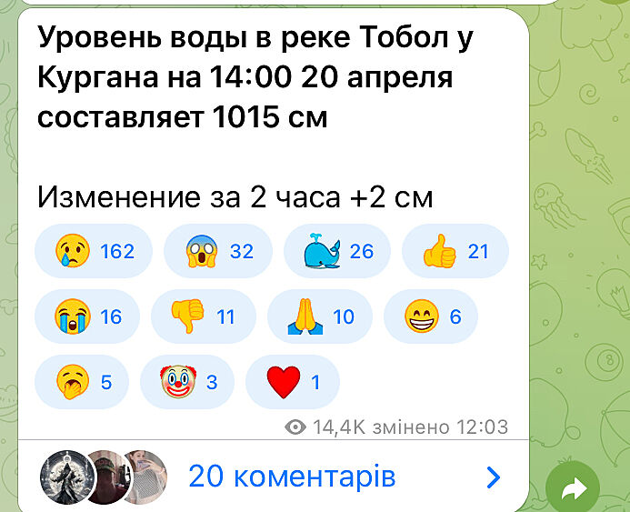 Останні дві години рівень води в Кургані перестав підійматись. Рівень води в р. Тобол піднявся з 343 см до 1015 см та зупинився.