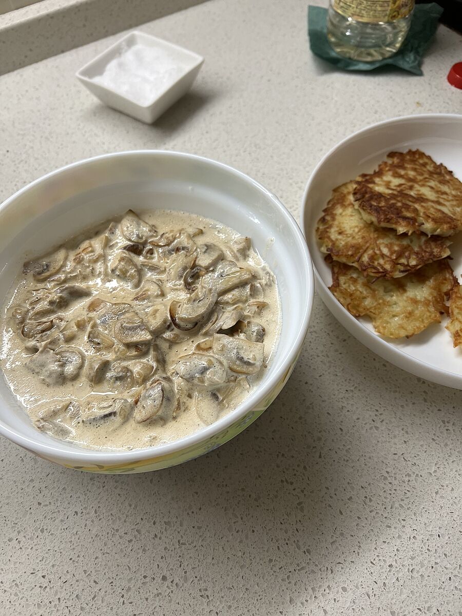 У нас драники с грибным соусом.
