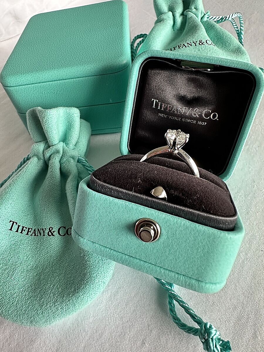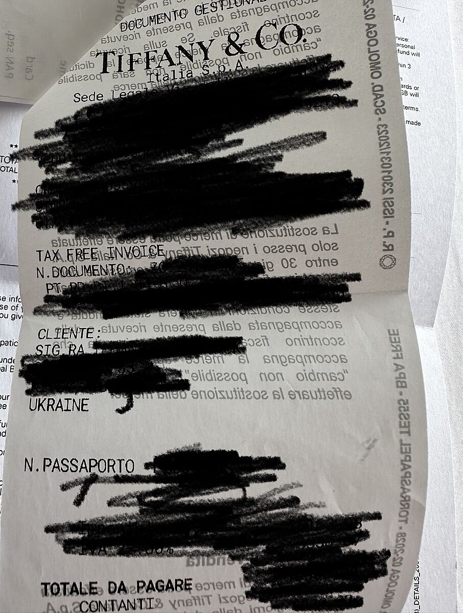 Это инфа для дьюти фри, которую вы заполняете сами. Никто вам не мешает сфоткать сам чек - где будет написано тиффани и что именно вы купили. Но скорее всего всего у вас бриллианты вырощенные в лаборатории или просто какое-то сваровски. Максимум 1000 евро стоимость этого кольца