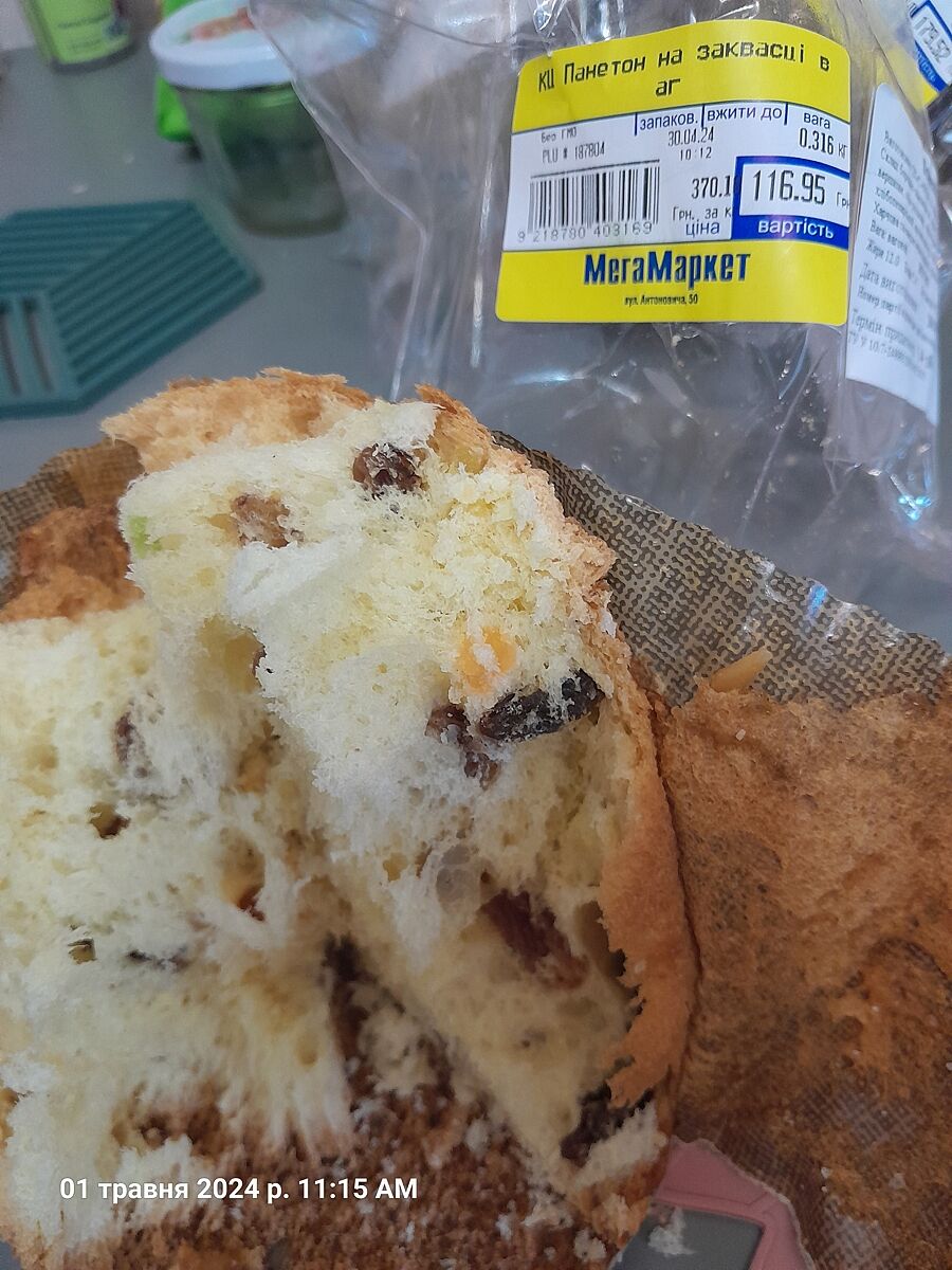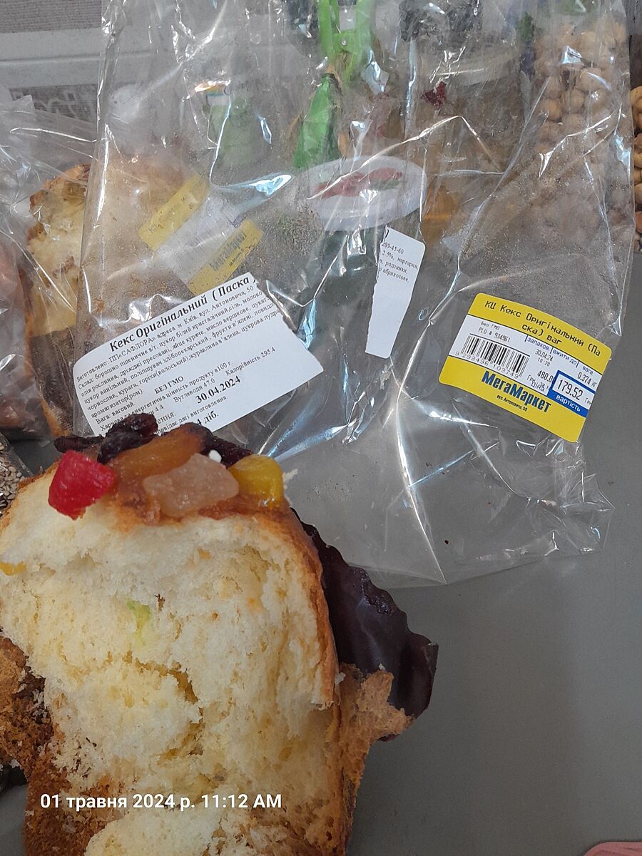 Так же взяла там паска ’панетоне на закваске’ 370 или 380 грн/кило. Она вкуснее, т к много изюма внутри.