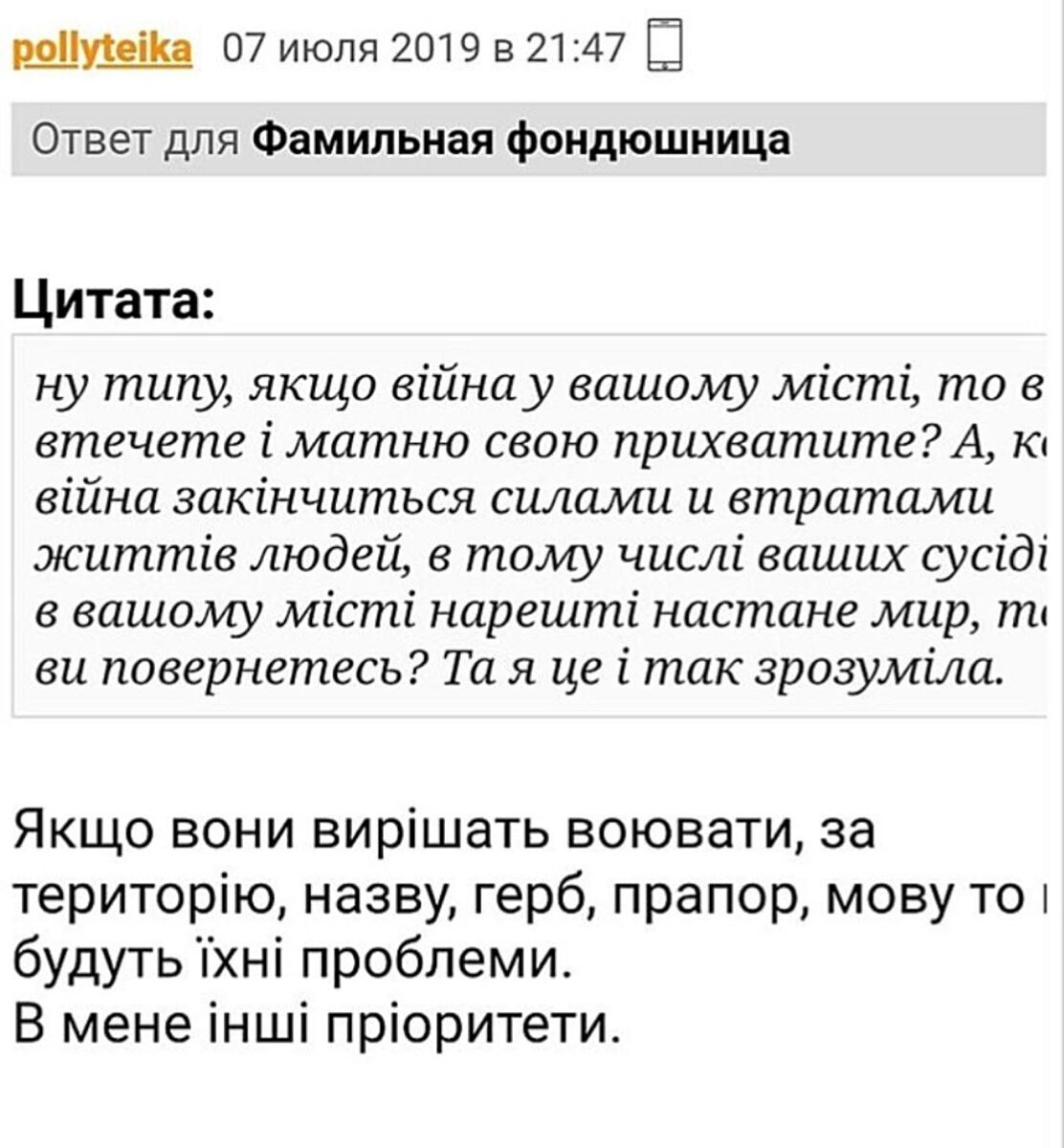 Там такий клінічний випадок. Якщо вона каже правду, то вона весь час масованих обстрілів Миколаєва була у місті. Серед її знайомих не може не бути постраждалих. І при цьому вона цинічно пише, ’ загинули не всі’. Тут геть відсутня людяність, бо людям властиві гуманізм, співчуття.