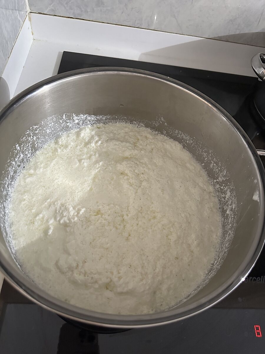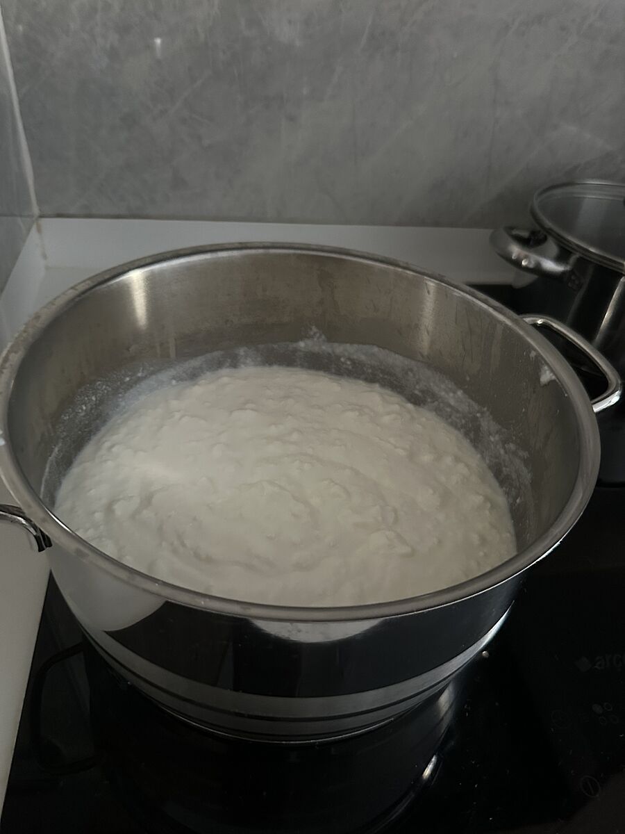 Йогурт в большую кастрюлю,нагревала до кипения на не большом огне , после кипел 5 минут и выключила , когда остыло полностью на сито ) очень просто но это так приятно,когда получилось