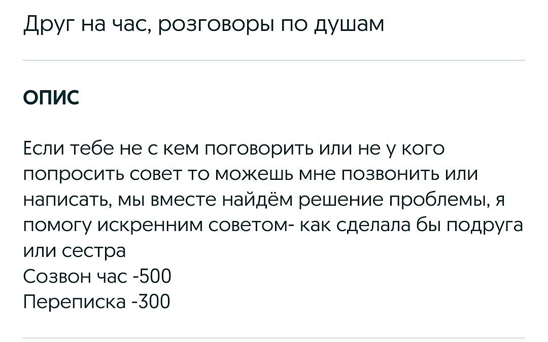 И как это работает? Ну вот допустим человек выливает душу этой подруге на час,но уже проходит час и она такая " а вы оплатите? Уже час проходит,киньте еще 500 грн на второй час"?