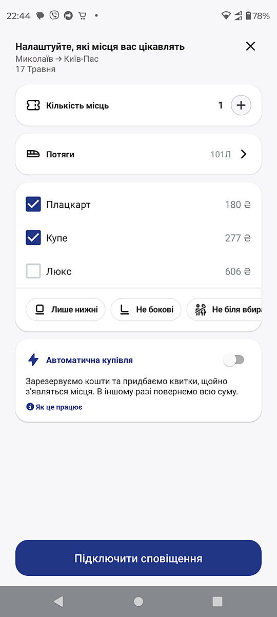 В додатку уз можна підтвердити себе через дію і поставити повідомлення від додатку про появу нових місць.Вибираєш які потрібні.Але ж не факт що додадуть.Може здасть хтось свої квитки то купите