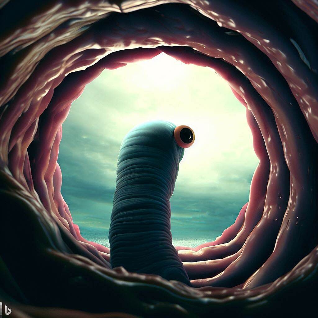 Глист осознал, что за пределами кишки есть другой большой мир. Он отправился к краю кишки и смотрит на внешний мир. Ему страшно, его брюшко дрожит, он боится неизвестности. Но в тоже время он чувствует надежду, любопытство и запах свободы.