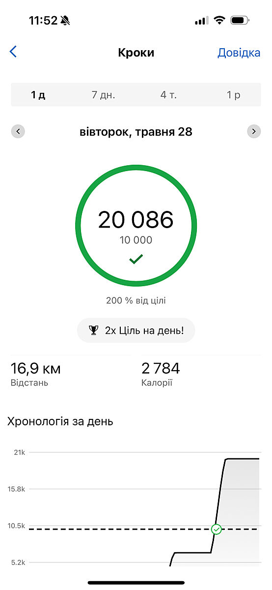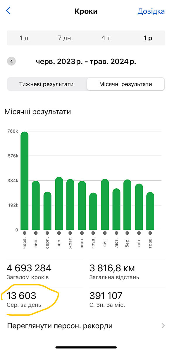Ще пів дня не пройшло, а в мене вже 5300 кроків, дитячий садок 800 метрів від будинку, відвела в садок, потім в магазин, буває в декілька магазинів + ринок, додому, потім працювати (сусідній будинок), відправити свої посилки - через дорогу, забрати з садочка, 1-2 години погуляти з дитиною, якщо відвести на гурток + 1 км в одну сторону. Всі мої справи на 99% поблизу будинку, але я не знаю як проходити мало кроків, постійно є куди йти. Середня кількість кроків за тиждень 12 тис, середня за 2023 рік 9600, 2024 рік 9900. І це в мене ще собаки немає, яку треба додатково вигулювати і старший син вже сам ходить в школу і на гуртки