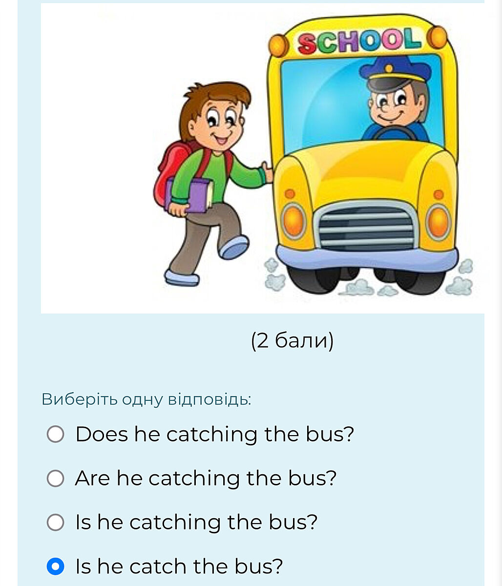 Вы тот Учитель английского, кто создал этот тест?)) ни в русском, ни в украинском не говорят словил школьный автобус.