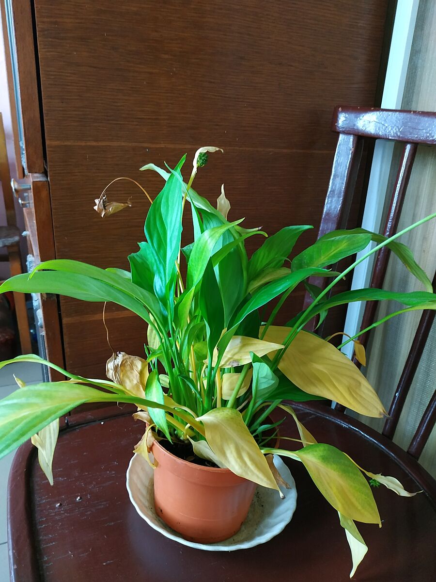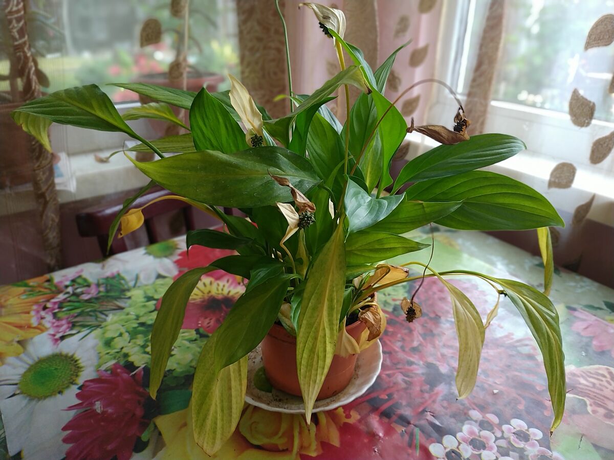 Обеспечьте правильный уход: Спатифиллуму требуется яркий, но рассеянный свет. Убедитесь, что он не стоит на прямом солнце. Регулярно поливайте растение, давая земле слегка подсохнуть между поливами. Избегайте пересушивания или переувлажнения почвы.