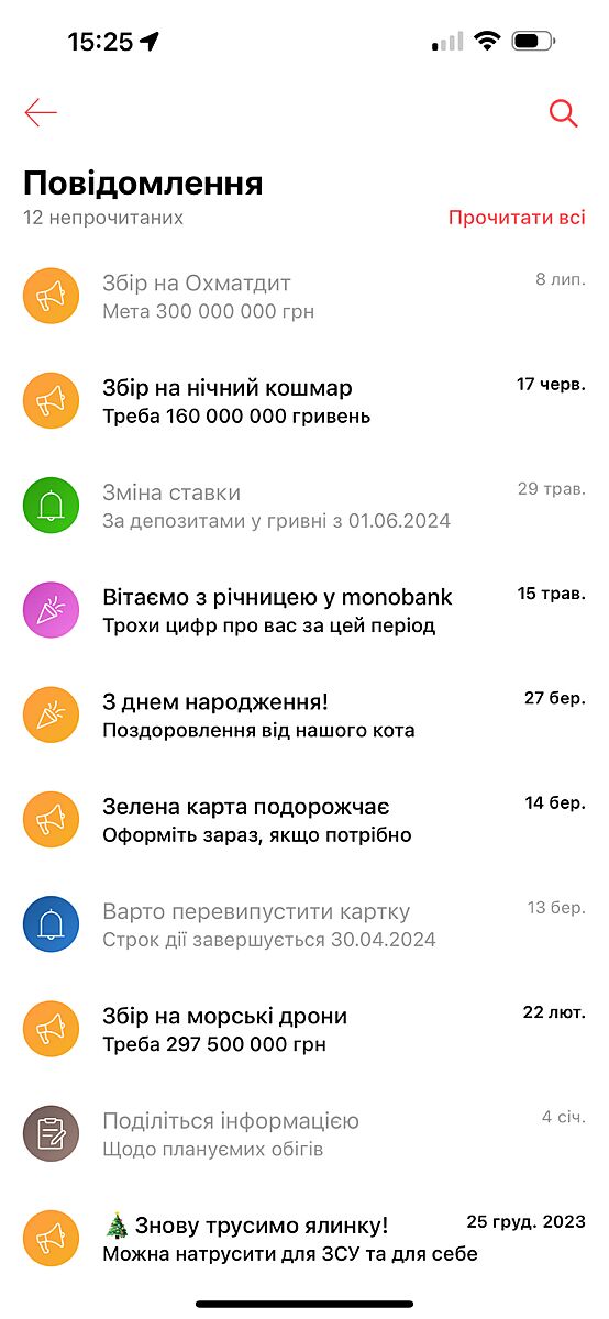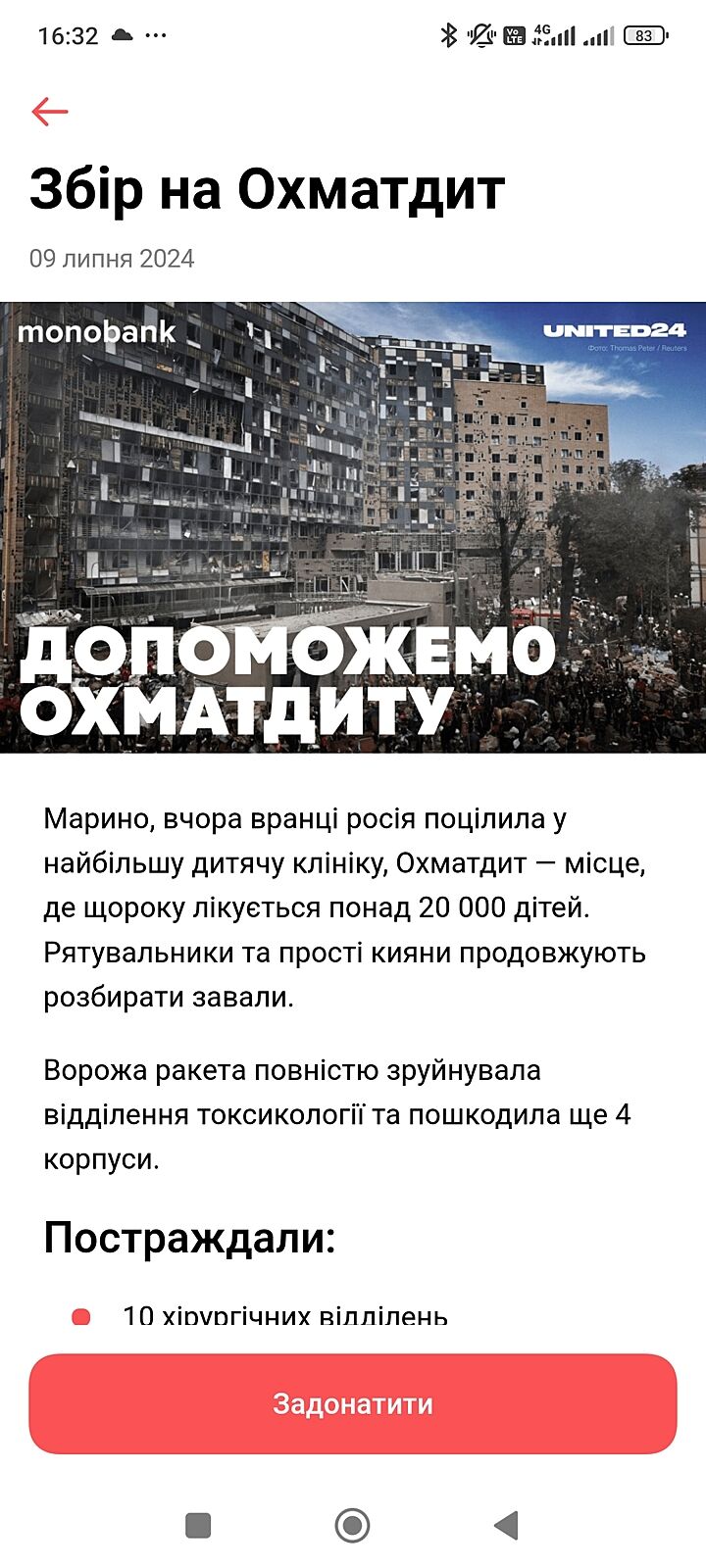 Пошла в уведомления, увидела только заголовок про сбор на Охматдет и дата напротив стояла 5.07. Но уведомление пришло точно 8го. Видимо техническая ошибка