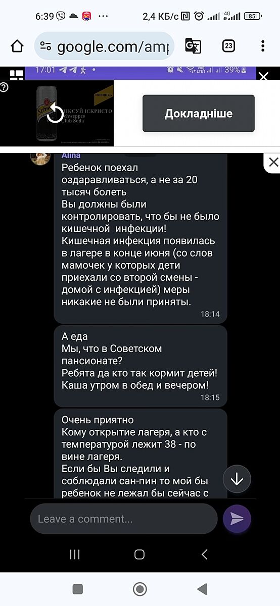 Я все розумію, може бути вірус. Але відношення адміністрації табору жахливе, про стан дітей ніхто не повідомляє, їх там ніхто не лікує. А на всі твої претензії відповідь одна - щось не подобається, забирайте. Лікарка хамло, каже що з дитиною все нормально, а коли заперечуєш, то відповідає - я цього не бачила, значить цього немає.