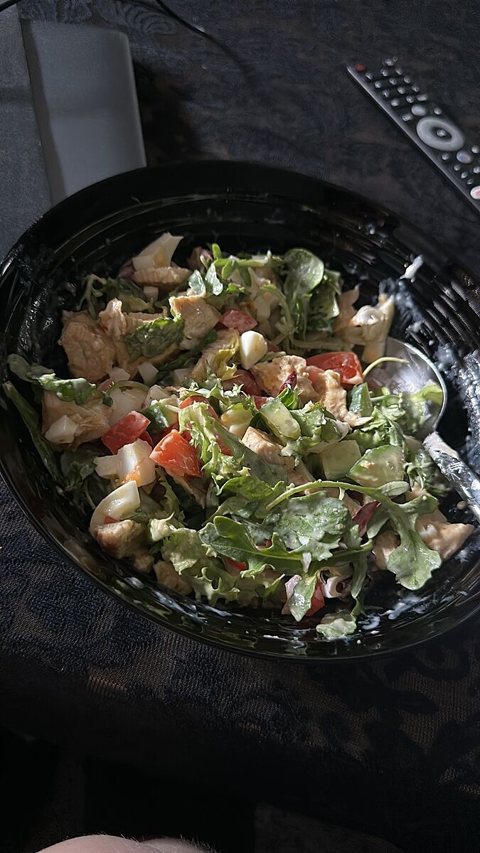 Грудка гриль куриная,2 яйца, огурец,помидор ,салат заправка из йогурта с чесноком 🤩 было оочень вкусно