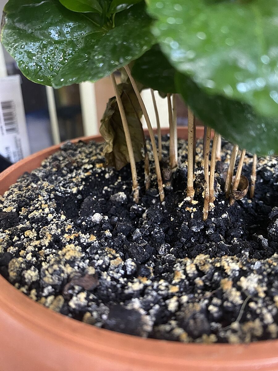 Від жорсткої води.Поливайте очищеною або дощовою.Зберіть землю зверху і замініть новою.