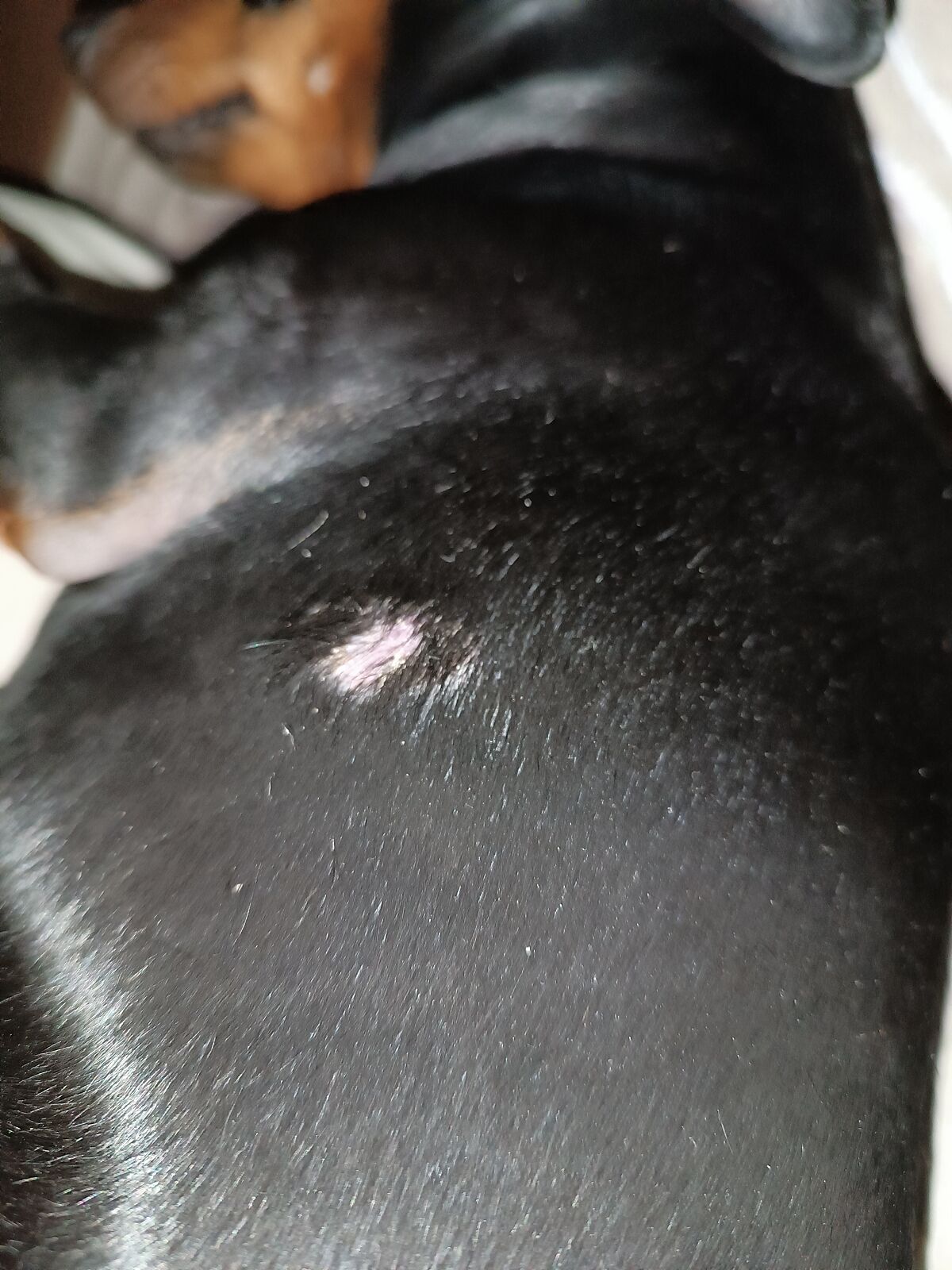 Место как бы круглое, корочкой взялось и шерсть достается. Но собака не чешет это место .