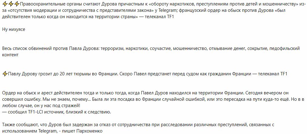 ❗️Дуров має бути представлений судді цієї суботи ввечері, йому висунуть обвинувачення щодо безлічі злочинів, — TF1