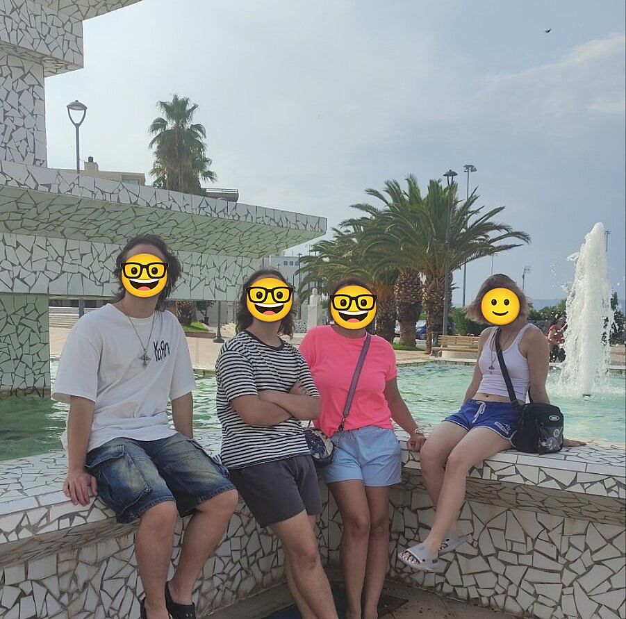 я в розовой футболке, вокруг меня мои дети - дочка и два сына