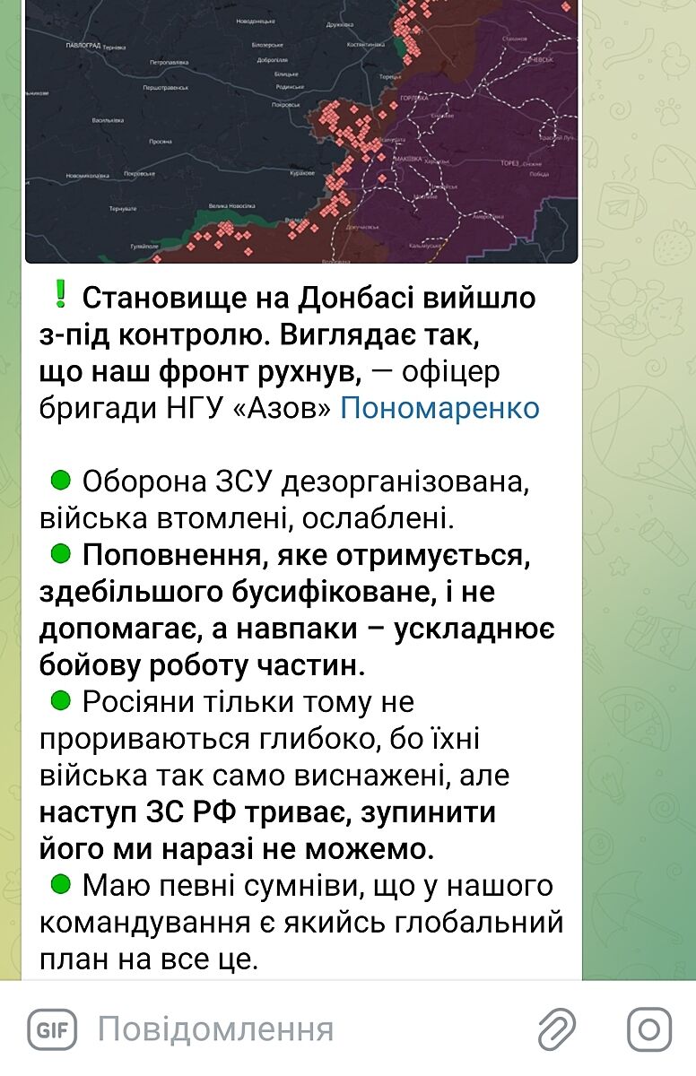 А Бутусов все пишет про провал в политически- военном руководстве именно участка этого, что там меняли командиров, что там немотивированные. На других участках лучше.