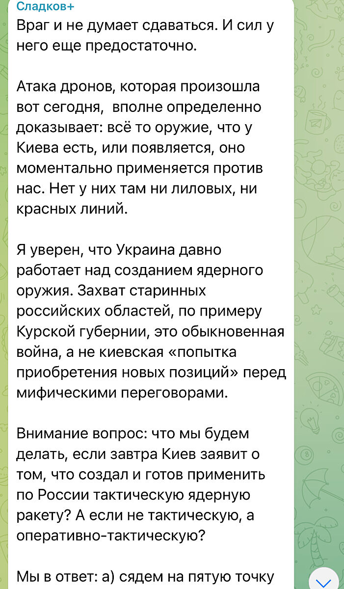 Я уверен, что Украина давно работает над созданием ядерного оружия. Захват старинных российских областей, по примеру Курской губернии, это обыкновенная война, а не киевская «попытка приобретения новых позиций» перед мифическими переговорами.