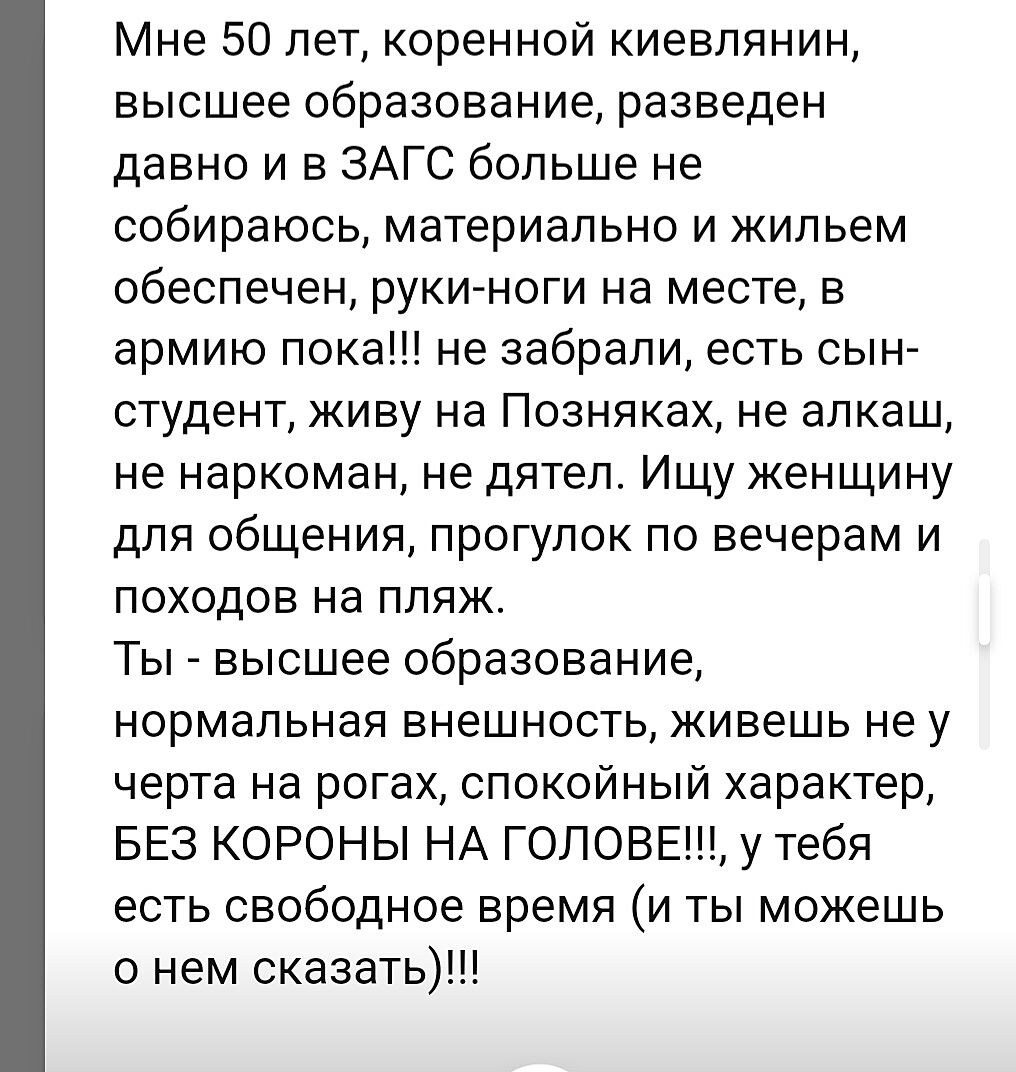 старый детный скучный, ищет киевлянку у метро (меркантил) и без короны (жлоб)
