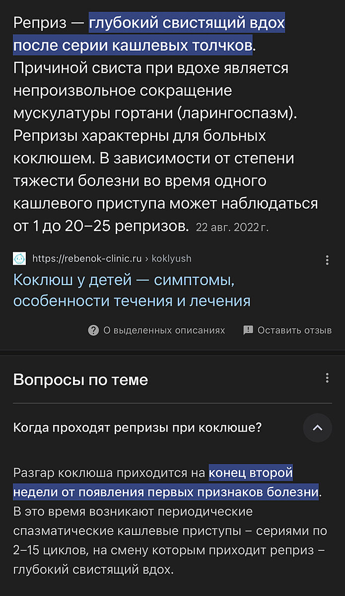 Вот так звучит коклюш. Спирает дыхание. Для меня эти 15 секунд были вечностью. Дочка мечется из стороны в сторону, глаза выпучивает, в грудь себя бьет. Я ей -ты дышишь? Кивает нет. Через пару секунд дышишь-нет. Самые ужасные приступы случались ночью. Мы потом придумали заранее вставать. Я высчитала время с каким интервалом происходят приступы, будила её и мы шли на кухню, пили чай, кашляли (я держала её за ручку, чтоб она чувствовала мою уверенность и знала что всё будет хорошо) и обратно ложились спать. Если бы я знала какая это ужасная болезнь, то мы бы сразу начали антибиотик. Но как вы уже поняли, обошлись без него. Такие дела