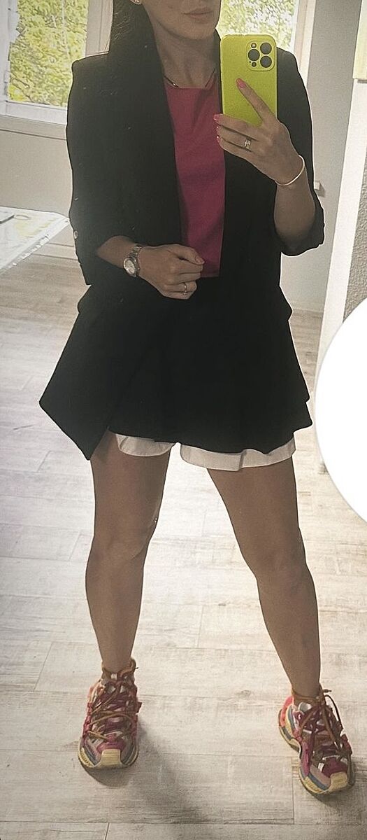 Мені здається масивні кросівки якраз візуально і роблять ноги коротшими. Потрібно щось ’легше’ на вид. Ну і низ школярки, а верх сам по собі, якось вони не дуже разом виглядають.